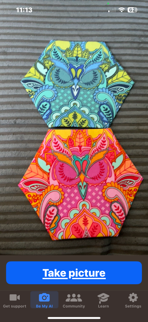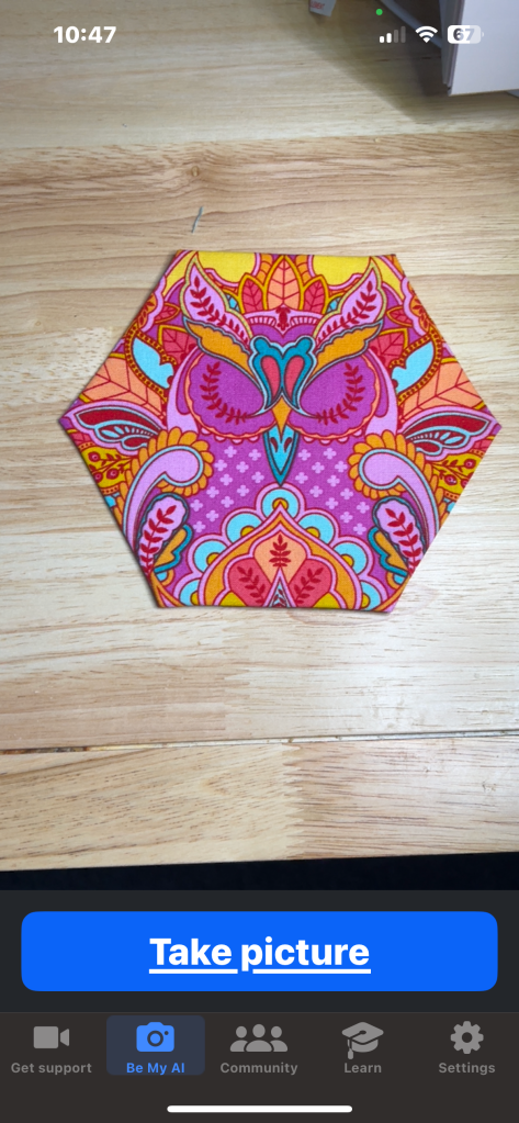 I’m having a slight leaking eye problem as this is the description the Be My AI function has come up with for the hexagon in this screenshot “In the picture, there is a hexagonal piece of fabric placed on a wooden surface. The fabric has three different patterns on it. One section of the fabric is purple with white polka dots. The second section has a dark blue background with green leaves. The third section has a vibrant pattern with what appears to be a colorful, ornate design featuring a bear’s face surrounded by flowers. The wooden surface is light brown with some natural grain patterns.”