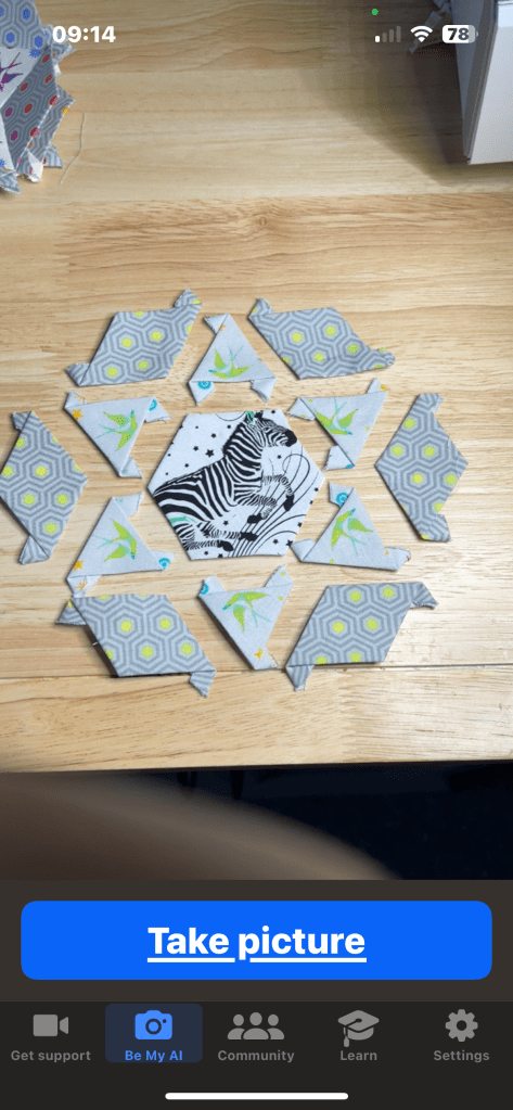 It’s a much better description than I expected. I can reply, asking for more details. Offering corrections. And though it’s confused by the shapes as it’s a hexagon in the middle with triangles around the sides and diamonds to fill in to form the big hexagon it had a good guess. The green plants it mentions are actually birds (on the triangles) that are in a stylised flying pose and placed so they face all directions as their bellies all face the central hexagon. And the “grey with yellow and white geometric designs” is on the diamond shapes and I would describe it as yellow hexagons framed by lines echoing the hexagons in a darker grey on a light grey background.