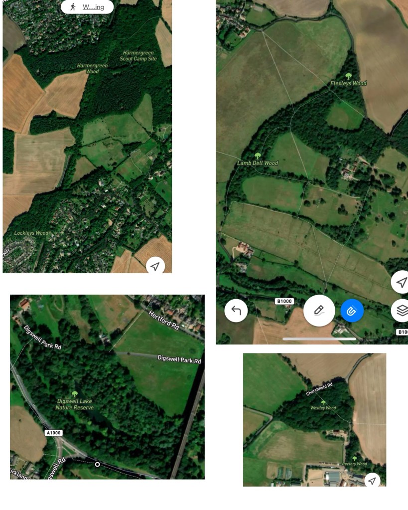 Top right is Harmer Green Wood and Loxleys Woods, the former being the largest out of town wood, and about the same size as Sherrardspark Wood which is 185 acres (74.9 hectares). The paths through these private woodlands are mostly permissive (allowed by permission of the land owner) and subject to necessary closures (usually due to tree felling, and other forestry work) with certain areas off limits one being an area that is a Scout camp and another being Barnes Wood which abuts the South East edge. Lockleys and Harmer Green woods are joined by a trunnel (a road or path where the leaf canopies on either side meet to form an archway) that runs next to the railway line and partly over tunnels that run under the 2 woods… and yes the idea of a tunnel under a trunnel is so much fun. This is on the North West edge of my range.