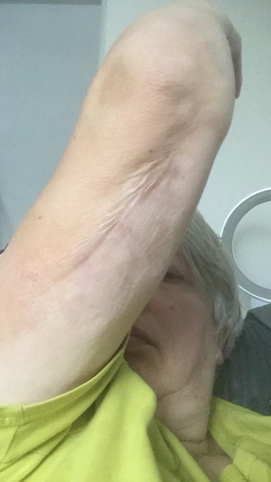 When I was little mum did her laundry in a “copper” with a mangle attached. While she was busy doing something else (probably putting clothes on the airer in the kitchen) my big sis and I in the outhouse dropped a “tea card” in the copper so decided to wring it out I was 3 or 4 and held the card towards the rollers on the mangle and sis was 5 or 6 and turned the handle. Unfortunately I didn’t let go and mum cane back to me hanging from the mangle almost up to my shoulder. Due to my age no bones broken but the friction burn left this wonderful scar as a talking point.”
