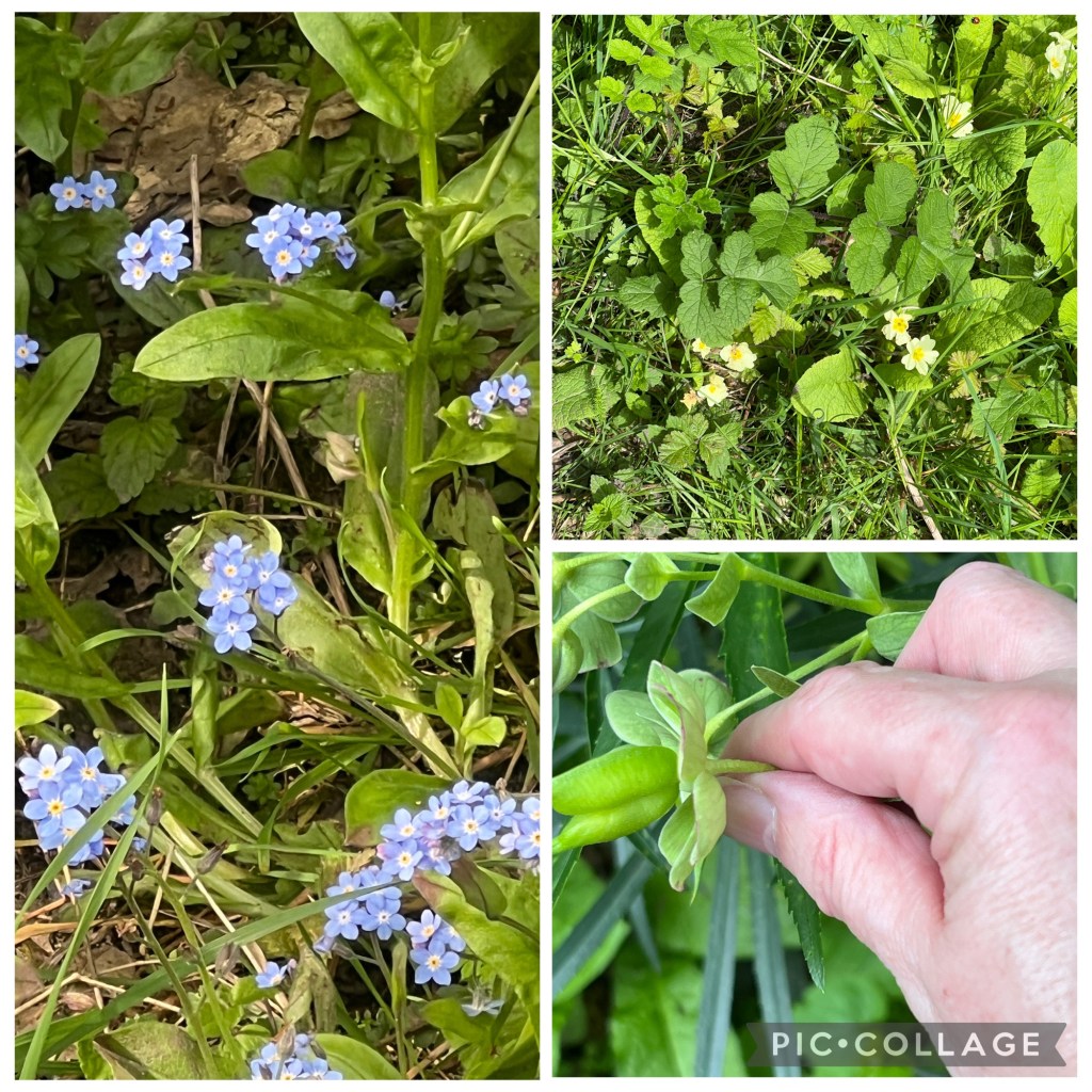 Left:- the tiny forget-me-nots with their blue petals around a yellow centre like an “o” of surprise.om r
